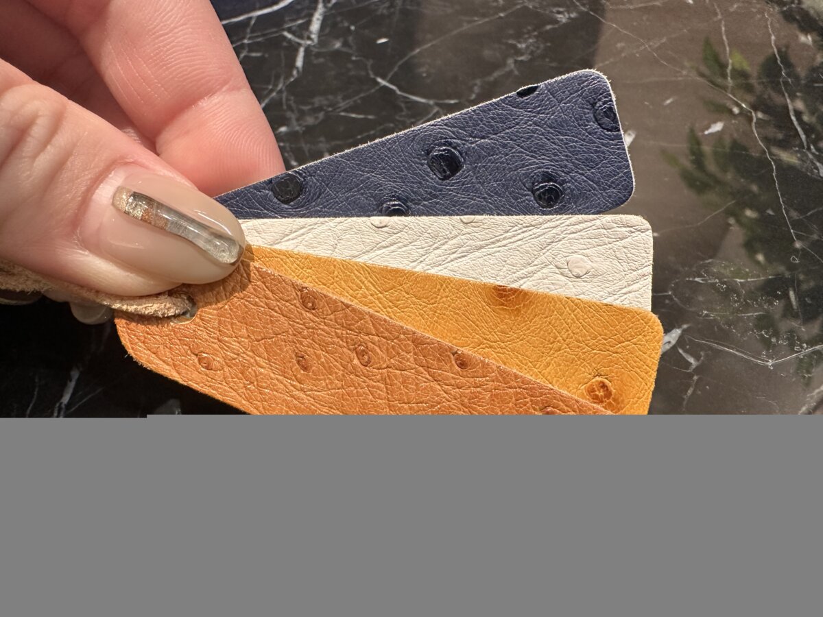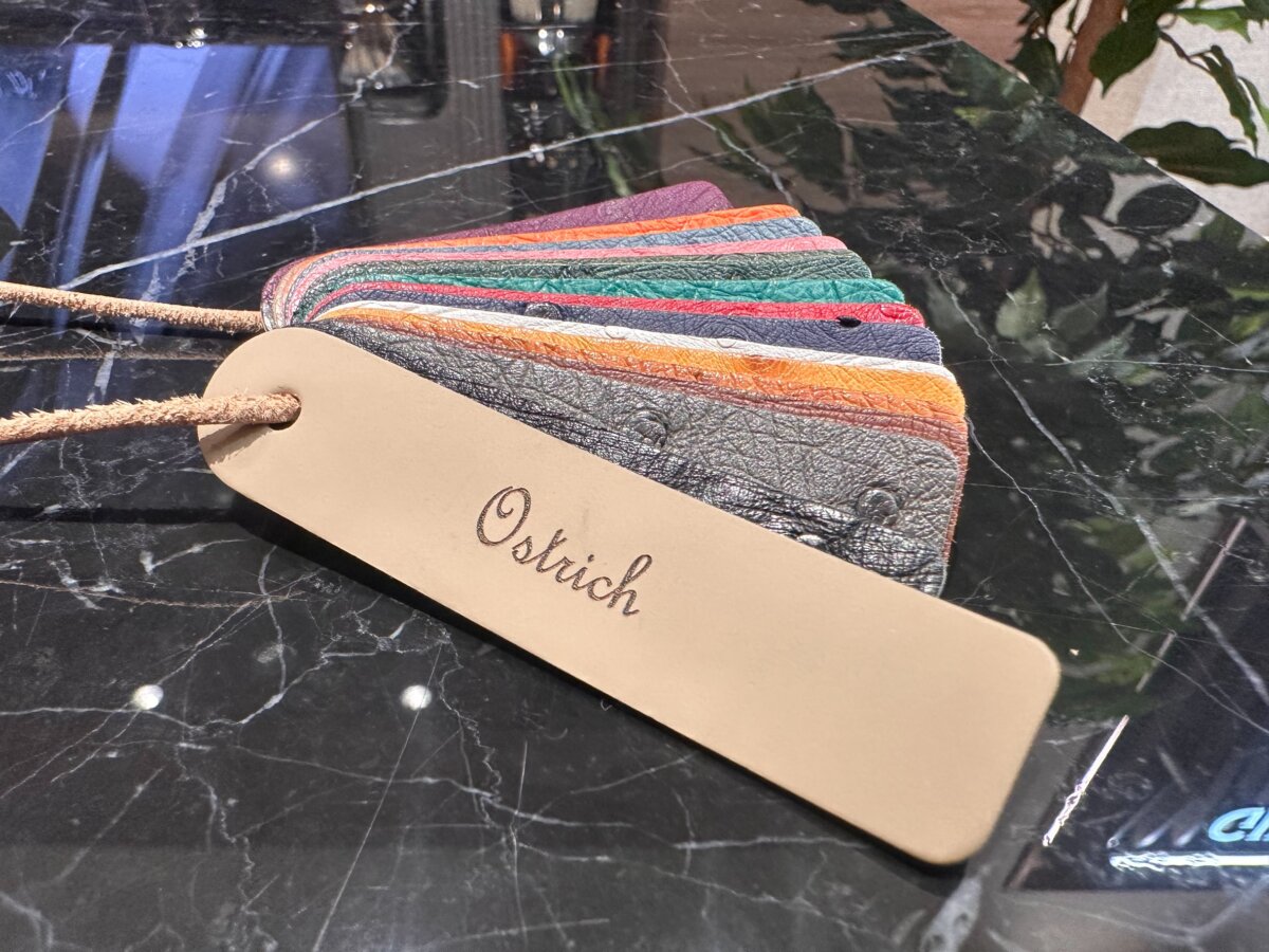 先ほどぼリザードと同じくエキゾチックレザーの仲間です。オーストリッチとはダチョウの革を使用した天然素材で表面にみられる丸い突起が特徴です。この独特の模様は羽根が生えていた跡であり自然が生み出した立体的なデザインとして他のどの素材にもない存在感を持ちます。柔らかくしなやかな質感に加えて非常に軽量で丈夫。さらに使うほどにしっとりとした艶が増していく経年変化を楽しめます。一目でわかる高級感と個性的な天然の模様が特徴的で愛好家の多い高級革です。