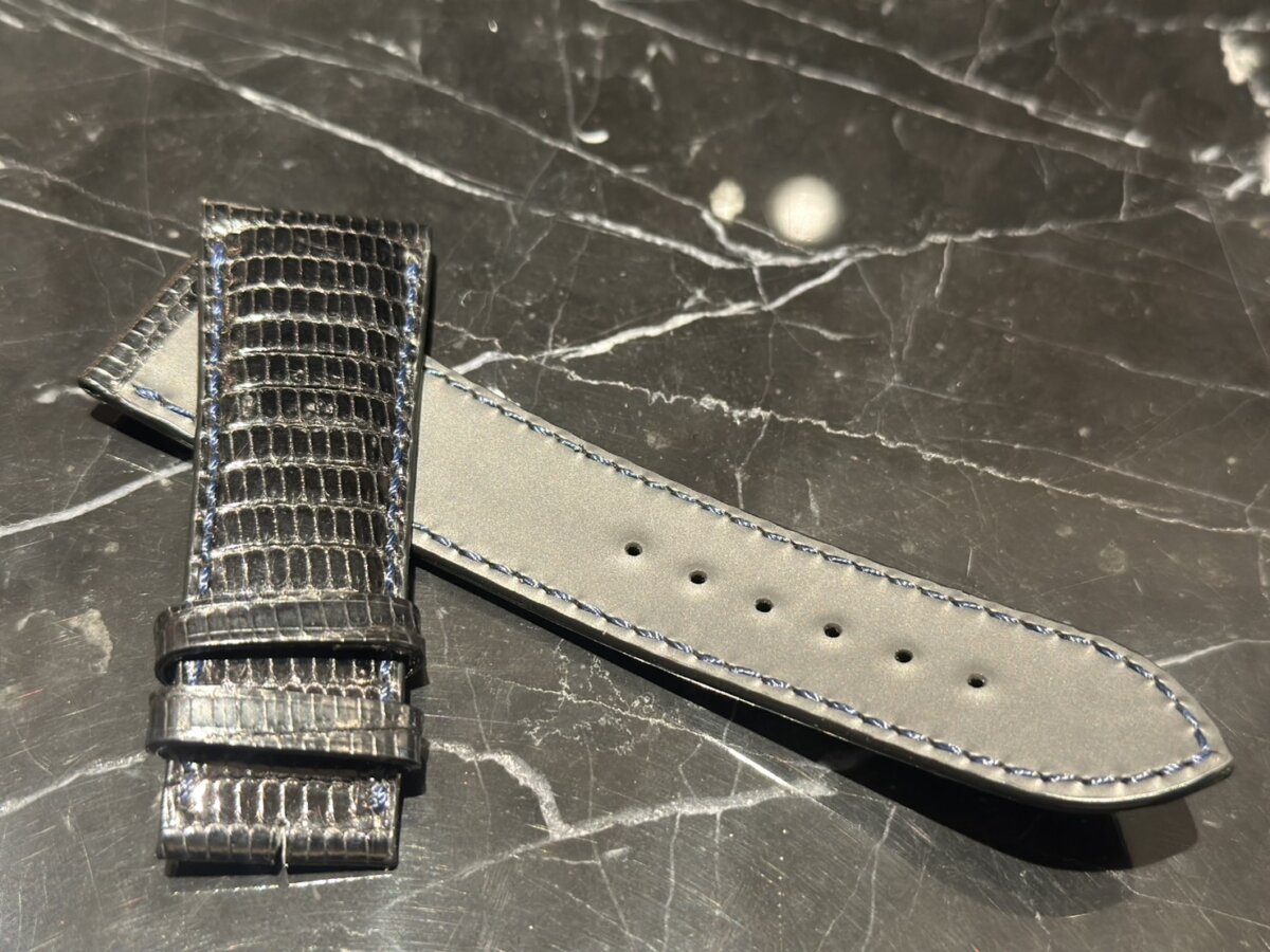 クロコダイルやパイソンと並ぶエキゾチックレザーの代表格にはいる『トカゲ革』のことです。主に「リングマークトカゲ」などの小型トカゲの革を使用しており、細やかで規則正しいウロコ模様が魅力です。アリゲーターのような迫力ある模様ではなく控えめな光沢と繊細なパターンが特徴的でどんな時計にも馴染みやすい万能な素材です。また表面がスムーズで硬すぎず柔らかすぎないため手首にフィットしやすく経年変化も穏やか。使うほどに艶が増し上品な風合いが深まっていきます。
