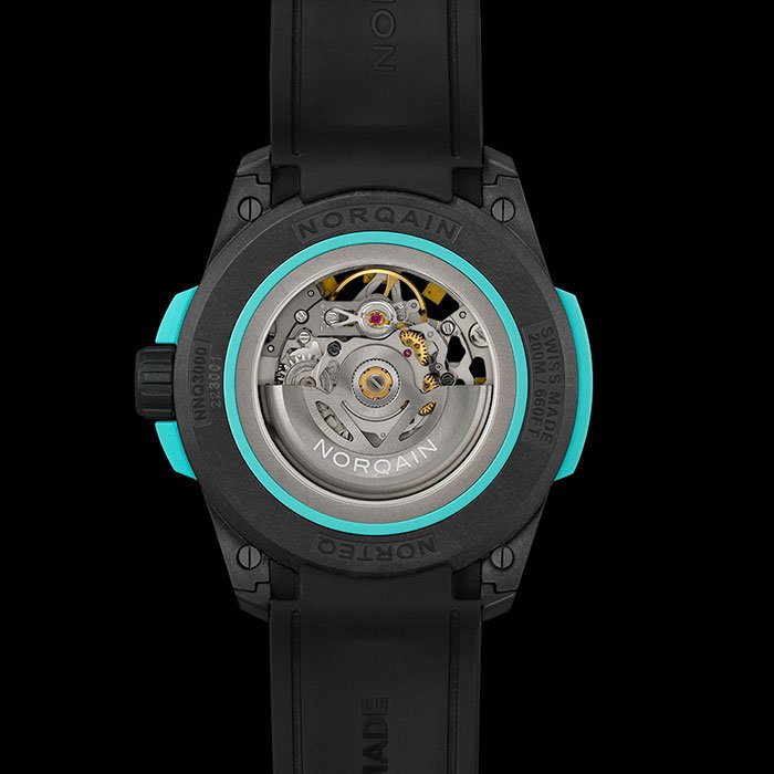 「ワイルド ワン スケルトン」は、魅力的なデザインを誇りながら、スポーツの衝撃や動きに耐えられる革新的なケース構造を採用しています。この時計は、スケルトンムーブメントNN08Sを格納したチタン製の容器をプロテクトするラバー製のショックアブソーバーを備えています。さらにショックアブソーバーを超軽量のカーボンファイバー素材、ノルテック製のブラックケースが挟み込みます。ショックアブソーバーに採用された魅力的なターコイズカラーは、オープンワークのブラックダイヤルにもプリントされています。スケルトンのインデックス、時針、分針にはターコイズブルーのX1スーパールミノバが、中央の秒針にはターコイズブルーの輪郭を持つホワイトのX1スーパールミノバが施された先端が配されます。ねじ込み式リューズは、ブラックラバーでオーバーモールドされています。
