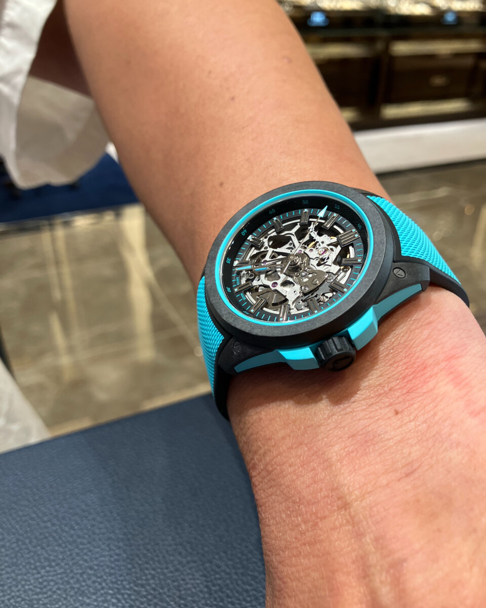 機械式腕時計でありながら5000Gもの耐衝撃性能を持ち、スケルトン×ターコイズブルーのビビットな配色に惹かれてご購入を決定!