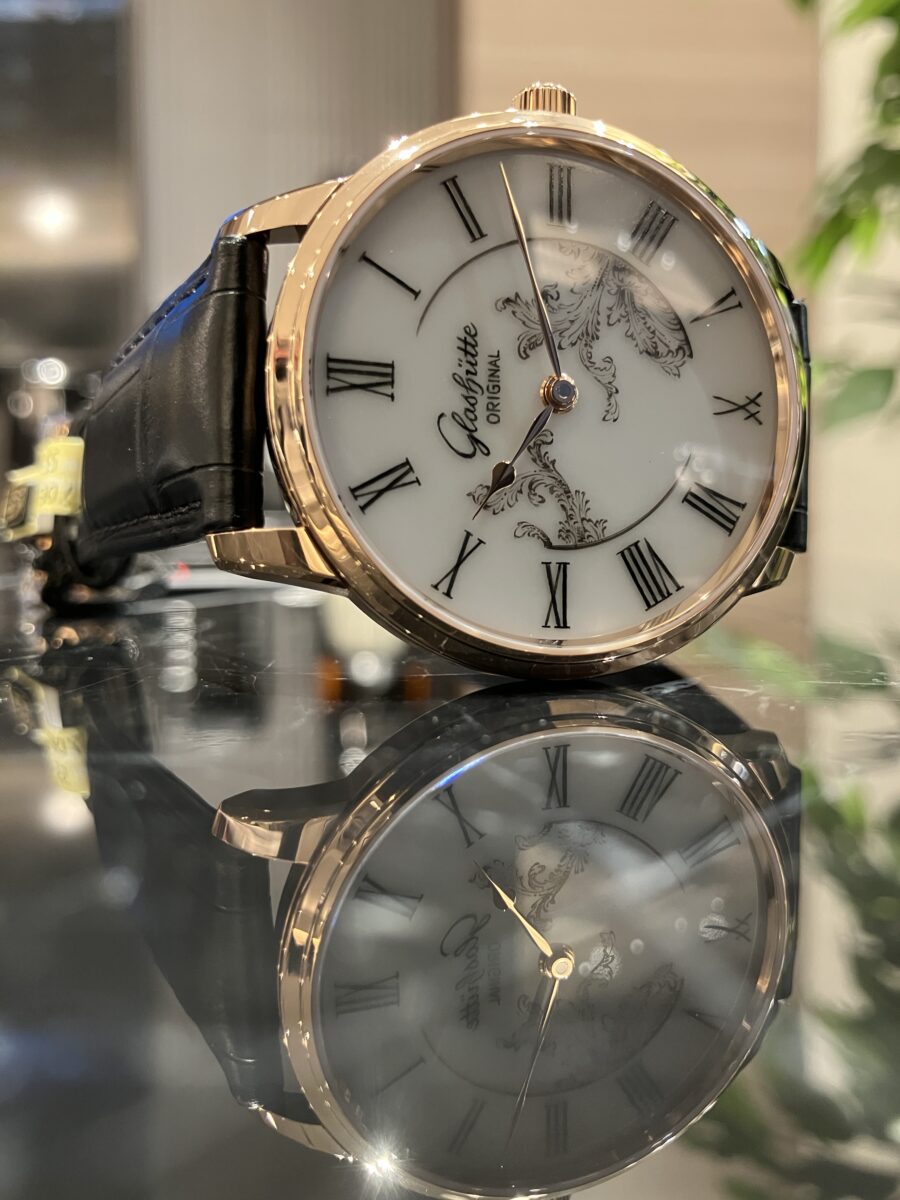 サファイアクリスタルのケースバックからはグラスヒュッテ・オリジナル独自の3/4プレートやグラスヒュッテストライプ仕上げとペルラージュ装飾、青焼きねじ、手作業の彫金など、グラスヒュッテ・オリジナルならではの特徴を楽しむことが出来ます。
