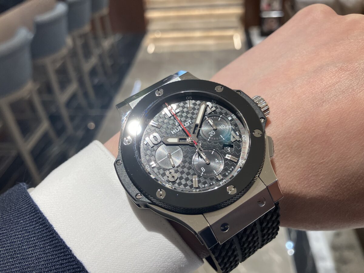 H型のビスを留めたベゼルや左右に張り出したケースサイドはひと目でウブロと分かる特徴です。