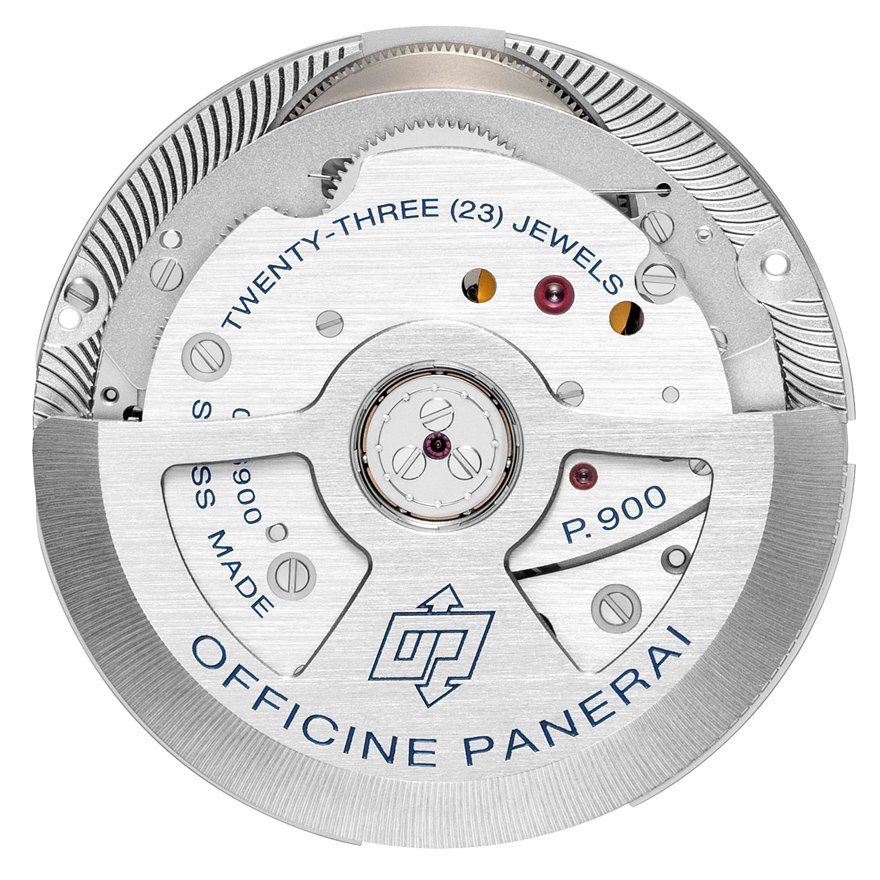キャリバーP.900の自動巻きムーブメントは直径28.2mm、厚さ4.2mmで、薄く設計されており、パネライも所属するリシュモン グループ傘下のエボーシュメーカー、ヴァル フルリエ社が手掛けたものであります。