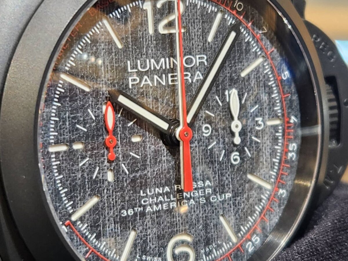 文字盤の中に小さな目盛り(インダイヤル)が密集しがちなクロノグラフですが、PAM01037はクロノ秒針と分針を中央に重ねることで、パネライらしい視認性をキープしています。