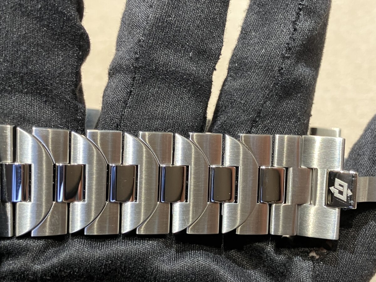 よく見ると、ブレスレットの繋ぎ目がパネライのシンボル「リューズプロテクター」の形になっているという、オシャレな隠し味もあります。