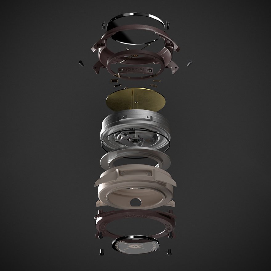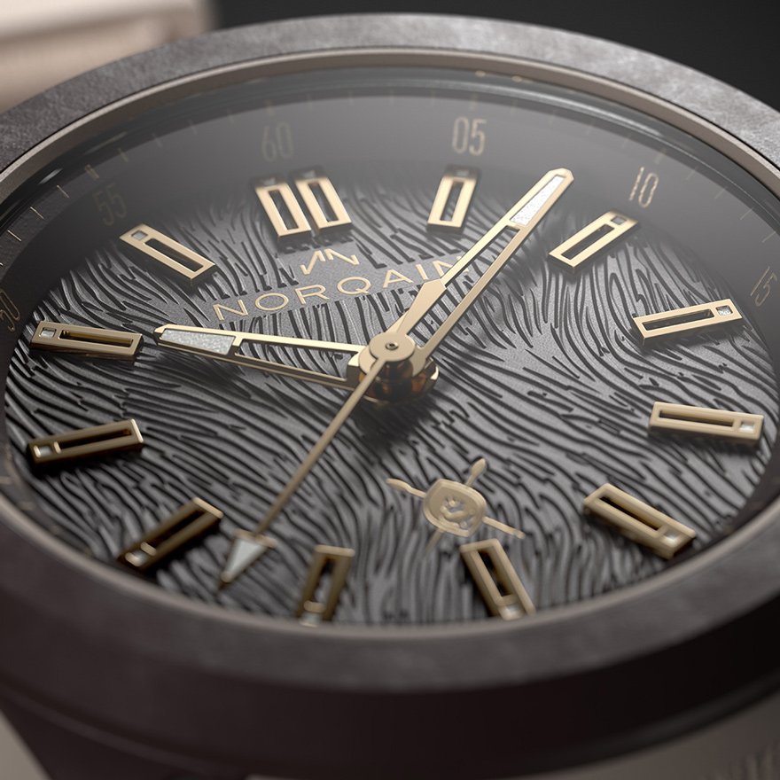 ケース素材に採用されている「NORTEQ®」は、ノルケイン、ジャン-クロード・ビバー、BIWI SAとのコラボレーションにより、ノルケインとその時計のためだけに開発されました。耐衝撃性に優れ、ステンレススティールの6倍、チタンよりも3.5倍軽いだけでなく、着色も可能で、ノルケインのデザインに創造と革新の自由を与え、非常に堅牢な素材です。