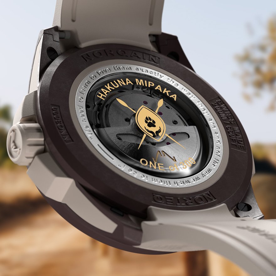 さらにケースバックの外周にはディーンのミッション・ステートメント「We need to learn to love them exactly the way they are and not the way we wish them to be!(私たちは彼らを、私たちが望んでいる姿ではなく、ありのままに愛することを学ぶ必要がある)」と刻まれており、ノルケイナー(アンバサダー)である野生動物保護活動家ディーン・シュナイダーの想いも感じる1本です。