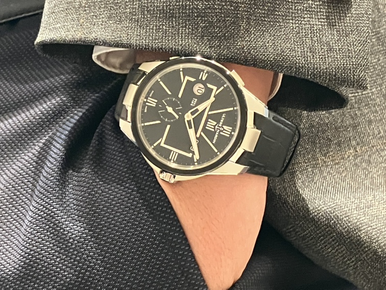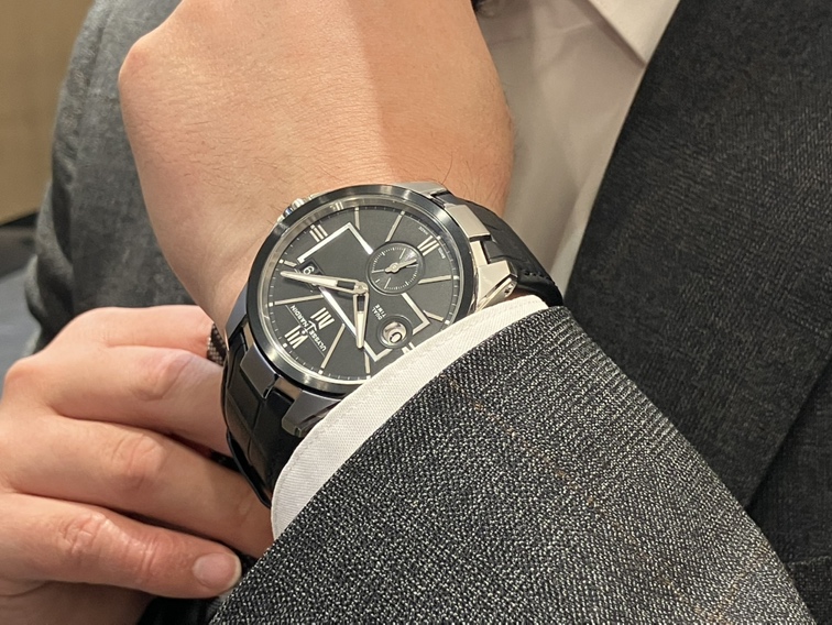 厚みやサイズ感も、実際に着けてみるとケースサイズが42mmなので腕への収まりが良く全く気になりません。さらに上質なブラックのアリゲーターストラップが合わさることで、スーツスタイルを格上げするエレガントさを醸し出しています。