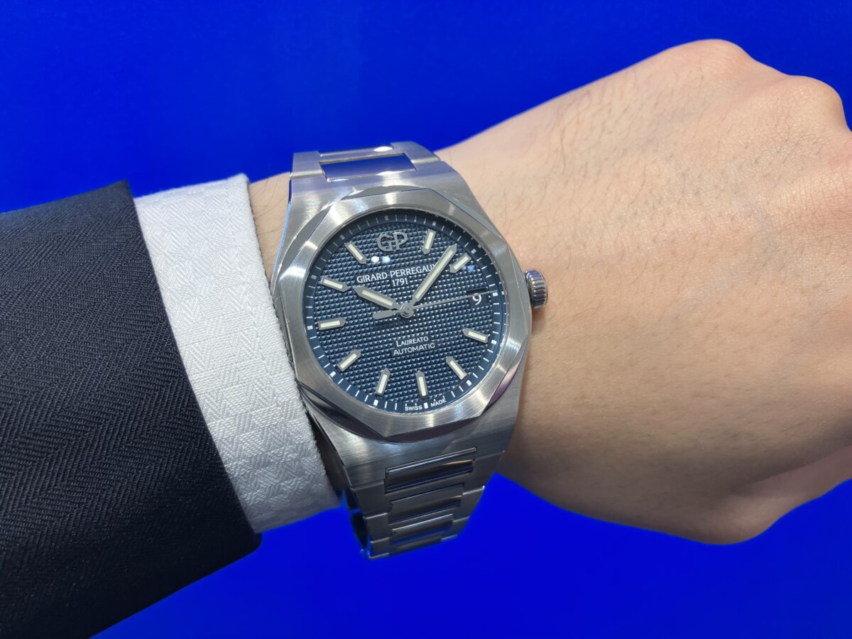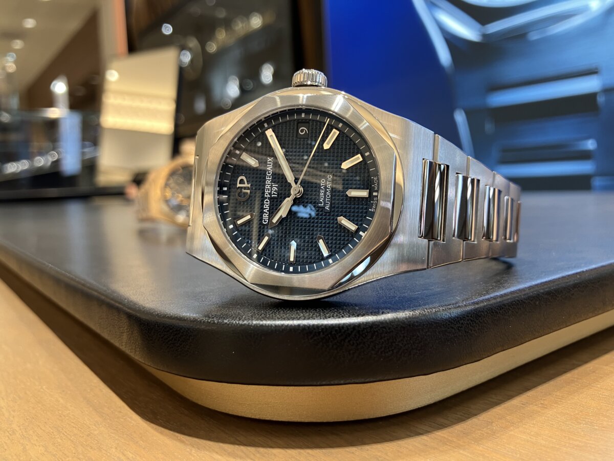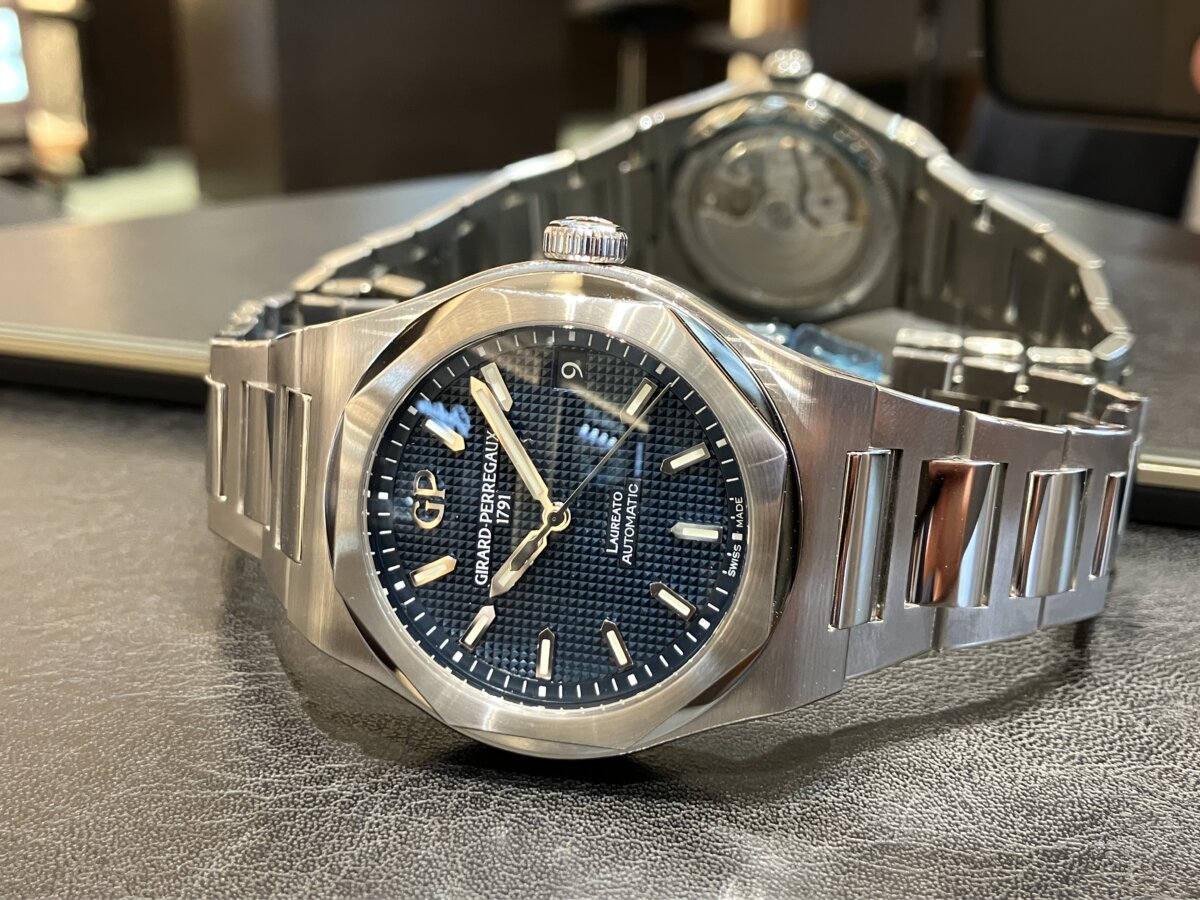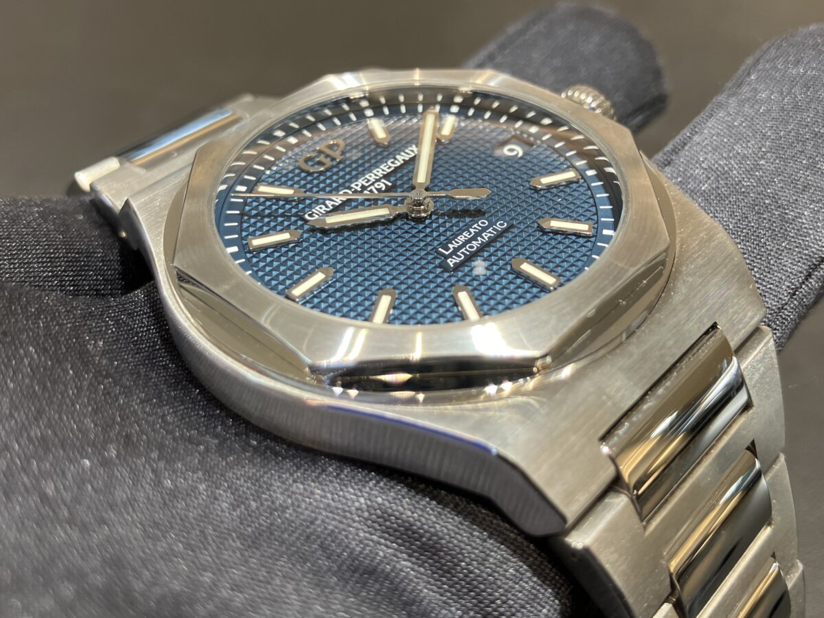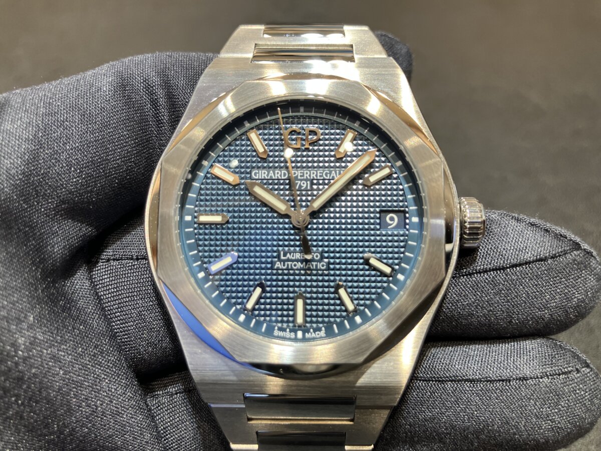 今回は時計の詳細はまた別のブログでご紹介したいと思うのでジラール・ペルゴの中で一番売れているロレアート42mmブルー文字盤を写真メインでご覧いただければと思います。