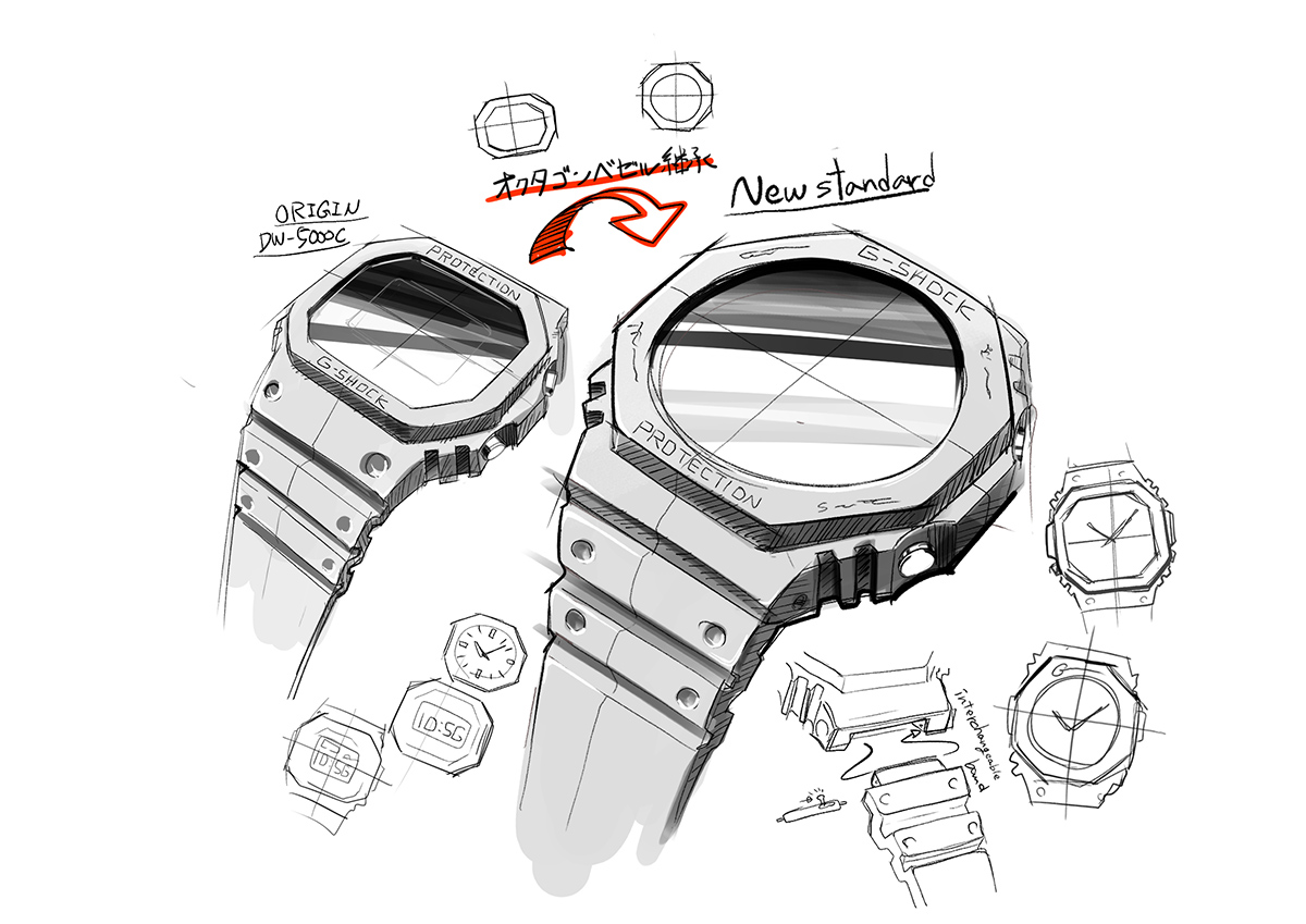 実はこの2100シリーズの八角形ベゼル誕生には初代G-SHOCK「DW-5000C」が深く関わっております。
