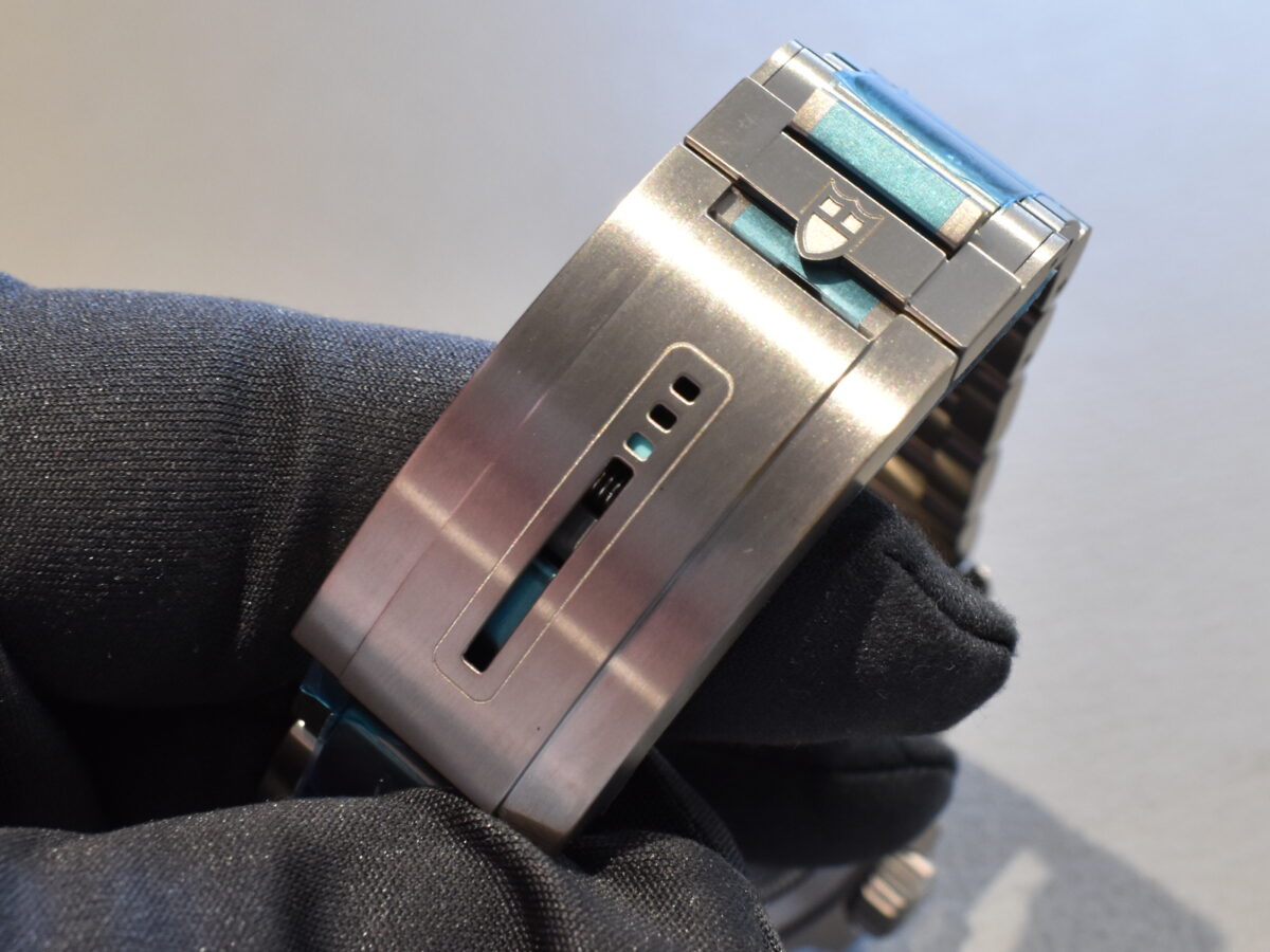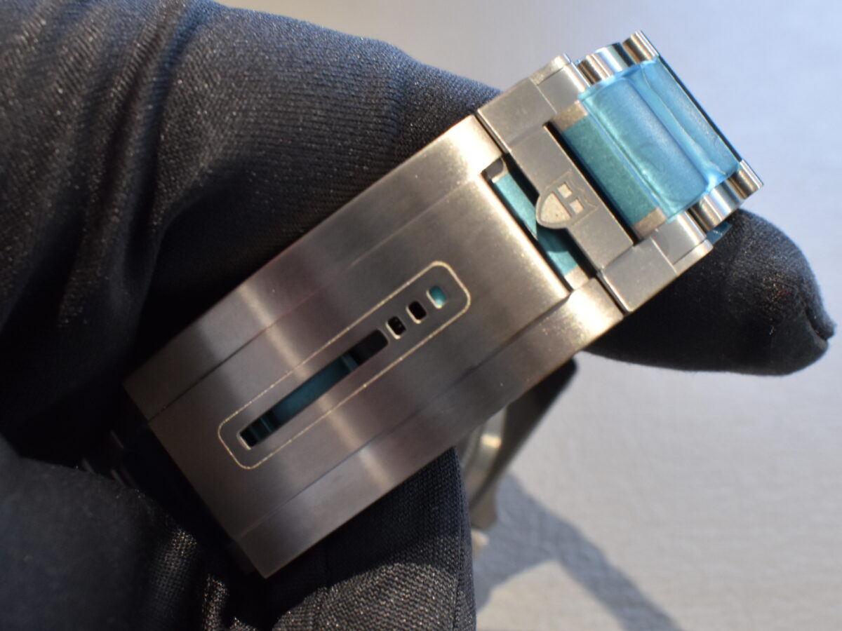 セルフサイズ調整を可能にするアジャスタブルクラスプを組み込んだフルサテン仕上げのチタニウム製ブレスレットを装備。クラスプには夜光マーカー付きのビジュアルインジケーターを搭載し、ブレスレットの設定状況を一目で確認可能。ペラゴスシリーズとしては初の機能になります。