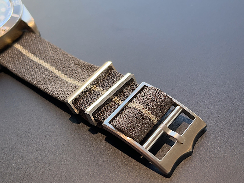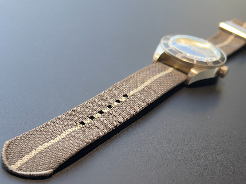 装着されているファブリックストラップは、世界最高品質のファブリックストラップを製造する、フランスの老舗リボンメーカーの”ジュリアン・フォール社製”のストラップを採用しています。